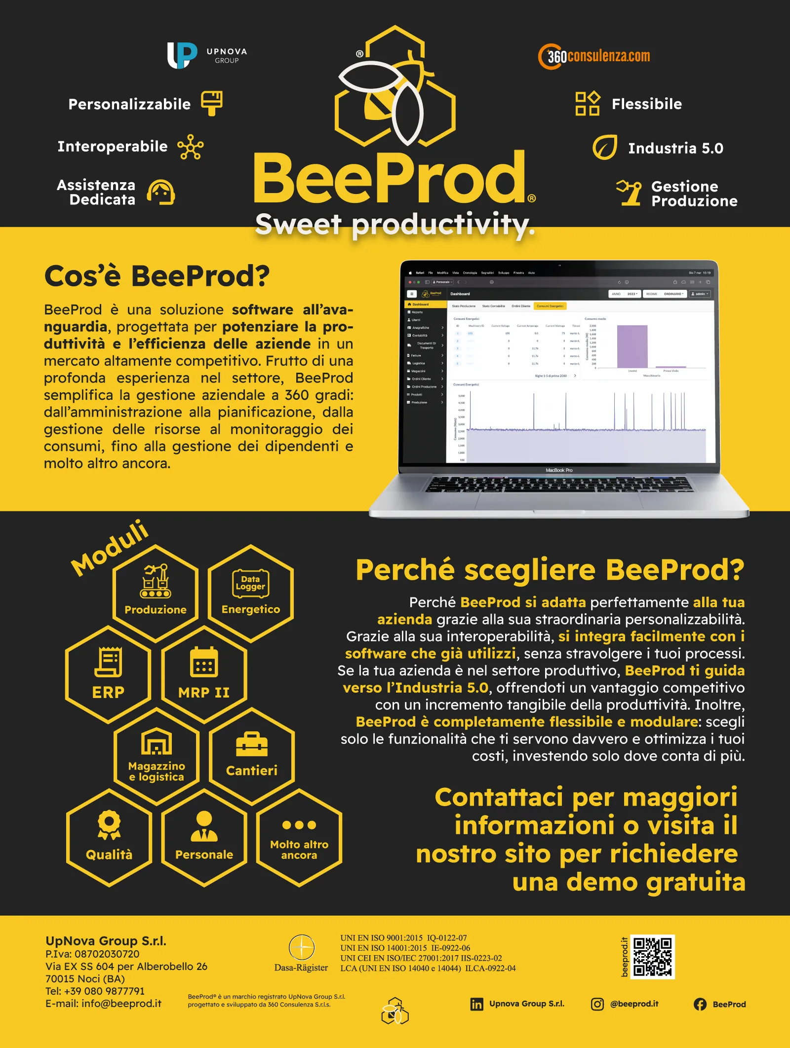 Il vero vantaggio, sottolineato nella pubblicità, è la personalizzabilità di BeeProd®. Questo software si integra facilmente con i sistemi esistenti delle aziende senza necessità di stravolgere i processi. Con la sua interoperabilità e flessibilità modulare, BeeProd® permette di scegliere solo le funzionalità più utili, aiutando le aziende a ottimizzare i costi e investire in ciò che conta di più.
