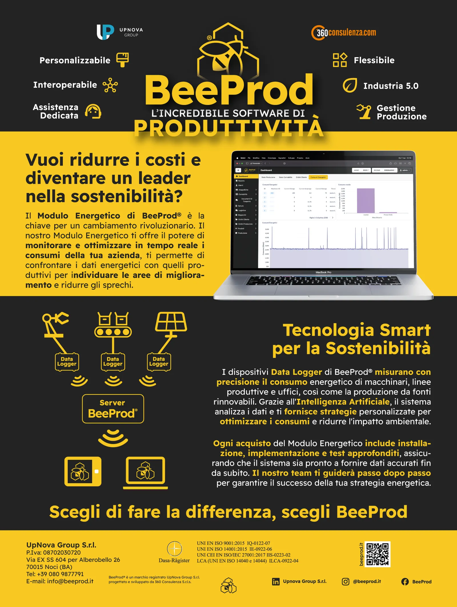 Con un focus sulla tecnologia smart e l’uso dei dispositivi Data Logger, la pubblicità sottolinea come BeeProd® permetta di misurare con precisione i consumi di macchinari, linee produttive, uffici e anche la produzione da fonti rinnovabili. Grazie all’Intelligenza Artificiale, il sistema fornisce strategie su misura per ottimizzare i consumi e ridurre l’impatto ambientale.